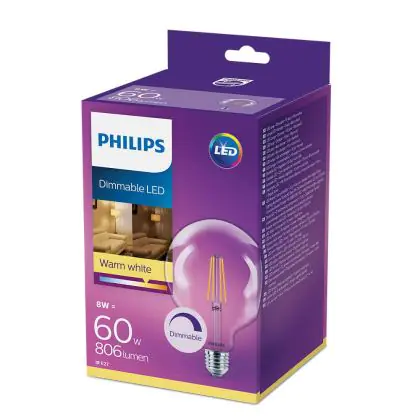Philips Classic LED Globe E27 Filament Clear 120mm 8W 806lm - 827 Extra Warm White | Dimmable - Replaces 60W
