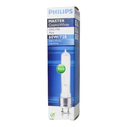 Philips CosmoWhite CPO-TW light bulbs are new generation discharge lamps that provide reliable and economical white light. Their operating cost is very low for a very high efficiency. Master Cosmo White have a compact size and are two times smaller than SON lamps. With a diameter of 19 mm, Philips CosmoWhite CPO-TW Xtra 60W 728 PGZ12 lampshave a PGZ12 base.